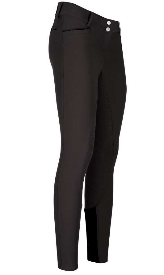 - Hinten auf der Reithose befinden sich 2 Dekotaschen, ebenfalls mit dezenter Glitzerborde und einem Schmuckknopf.