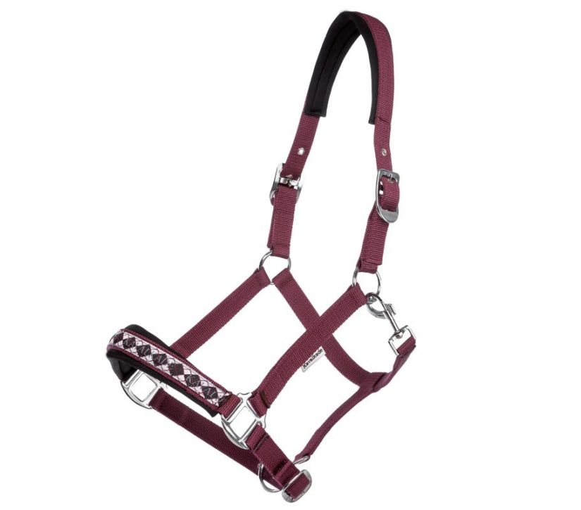 Das Nasenzierband im Karodesign ist farblich abgestimmt Das Halfter ist beidseitig verstellbar u.im Genick sowie am Nasenband sehr weich unterlegt. Die Beschläge sind in silber.
