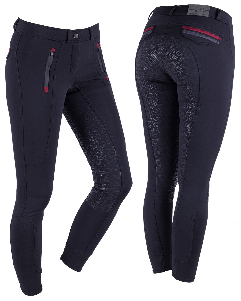 Dieses Modell hat rote und graue Akzente an den Reißverschlusstaschen auf der Vorderseite und Deko-Taschen auf der Rückseite. Dank dem Grip-Vollbesatz mit grafischem Muster, hat der Reiter eine gute Griffigkeit im Sattel.