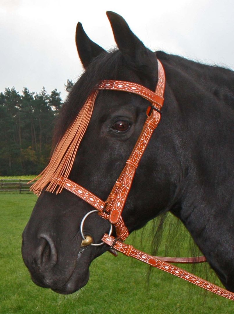 Ein echtes Meisterstück von unserem spanischen Sattler. Aus bester Lederqualität gefertigt, mit Leder-Mosquero u. mit feinen ausgestanzten Verzierungen, die hell unterlegt sind. (Repujadas). Made in Spain