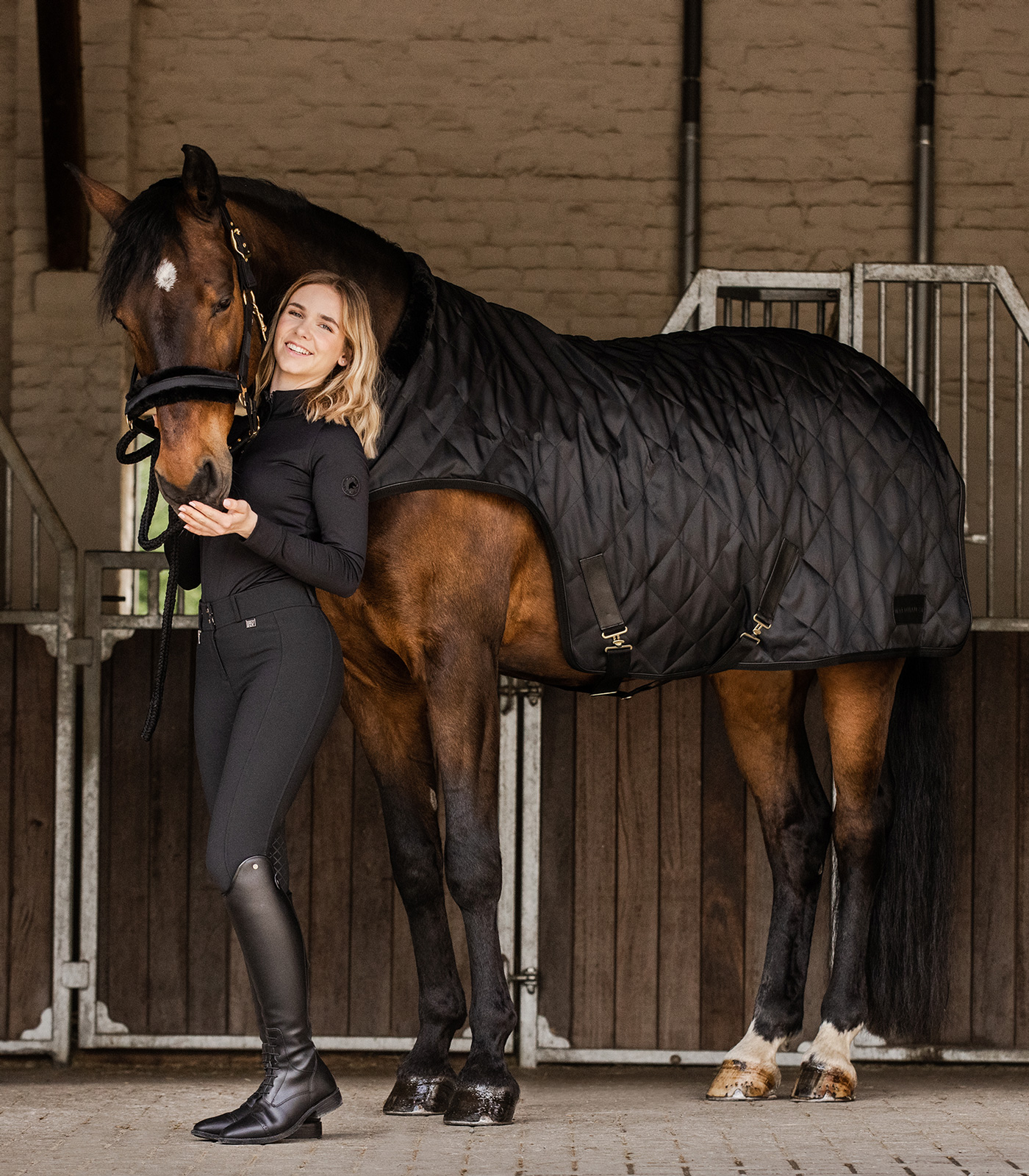 Hochwertige, sehr edle Führmaschinendecke gefüttert mit künstlichem Kaninchenfell für die kalten Tage. Das Fell speichert optimal die Körperwärme des Pferdes, ist besonders weich und verhindert Scheuerstellen. Durch das Felldetail am Widerrist werden Druckstellen verhindert. Mit längenverstellbarer Kreuzbegurtung, T-Frontverschluss und Metallösen zur Befestigung eines Schweifriemens.